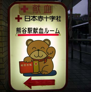 忘れた頃に続く 「熊谷のくまさんマーク」 シリーズ(^^)今度はこのコ…熊谷駅北口の階段下にある、熊谷駅献血ルームのくまさん♪ちょっと、くまがや館のつくばくん御一家と親戚っぽいねこれって熊谷限定?? 調べたら、厚生労働省のほうでけんけつちゃんっていう全国的な献血PRキャラ(そのまんま過ぎるネーミングだなあ…)がいるし、埼玉県ではまた別に「エビオくん」ってキャラがいるみたいだし…どうやらこのクマちゃんは、熊谷独自のキャラクターと思って良さそう?さあ…ブログに心血注ぐ見栄子、今日は文字通り、血を捧げてくるよ!!いえ別にブログの為じゃないからね(^^; 献血は世のため人のため!私みたいな血の気の多すぎる生き物は、足りない人にちょびっと提供すべし!!でも献血って久しぶり、しかも成人してからは熊谷でするの初めてかも…ドキドキ♪前にしたのは何年前だろう、銀座の西銀座デパート前にいつもいる献血車だったわ。受付で献血経歴を聞かれたので「5年くらい前かと…」と答えたけどもう記録は残ってないみたい。 新規登録扱いって事で、申請用紙に記入。ロッカーに荷物を入れ、タッチパネル式の問診票でいくつかの質問に答え、海外旅行の履歴を聞かれ、さらに飲んでる薬がある関係で色々聞かれ…血液から病気とか移ったら大変だもんね、血を提供するにも審査は必要!そして目の前で血液型を調べられ…ふ~ん、□型は△色の液体で凝固するんだ?(ちなみに私、血液型話で盛り上がるのも、型に当てはめられて「やっぱり~」言われるのも大っっ嫌い!! 何が面白いのか全く意味わかんないし、人が何型か聞かされても興味ないからスグ忘れる。 だから、私が何型かは教えないよ~♪ 血液型話のコメントもやめてね。ただし「私も嫌いです」っていうのは大歓迎! …本当にその位キライなんだよ(^^; )さらに先生の問診と血圧測定…薬のことでまた色々聞かれはしたけど、とりあえずクリア♪いよいよ本番の献血だあ♪ うわ、椅子というか台には液晶テレビがついてる!すごいね…待合室に色々用意されてるだけでも凄いと思ったのに、今時はこんなのまで。これなら血を採られてる間も全然退屈しないね。 右腕で検査を受けたので、本番は左腕。射されるときにちょっとチクッとするだけで、あとはなんにも感じないね…大人は400mlが基本、5分位だったかなあ? あっという間に終了。腕に止血バンドを付けてもらい、「水分をとって15分くらい休んでいって下さい」と。そんなワケで、いろいろ置いてある待合室へ戻る。とりあえず水分いただこうか。おおっパックのジュースかと思ったら、今時はこういうのなんだ…コレ飲み放題っ! お金入れなくても出てくるんだよ~快感♪(^◇^)お菓子もこんなに用意してあるよ…あらら、ポケットに入れてるオジサンが(^^; とりあえずアクエリアスを一杯飲みながら、クマさんの隣でまったり。この「熊谷」の「谷」って字、クマさんの後ろ姿に似てるな~なんて思いつつ雑誌もたくさん置いてあるけど、本持ってるからこれでいいや~。なにいっケーブルテレビも観ほうだい!? 本当に、至れり尽くせり…ね。それだけ血液は貴重なもので、提供者は感謝されるって事か。オヤ 「らんま1/2」 やってる、懐かしい(^^)こんなの観てると思い出すなあ…高校生の頃 「献血が趣味!」 って友達がいたんだよ。某アニメで「戦士の血液を捧げることによって戦闘用の鎧が蘇生する」って場面があって、その影響でね(^^; そういえば彼女が好きだった、そのキャラクターの声優さんは数年前に亡くなったんだって? 悲しいね…交付された献血カード、それからポイントカードと海外渡航履歴カード。献血は、無料の血液検査にもなる…10日くらいの間に結果が送られてくるって。受付時間はこんな感じ、年末年始以外は無休!マンションはスグ近くなんだし、たまには思い出して献血しようっと♪