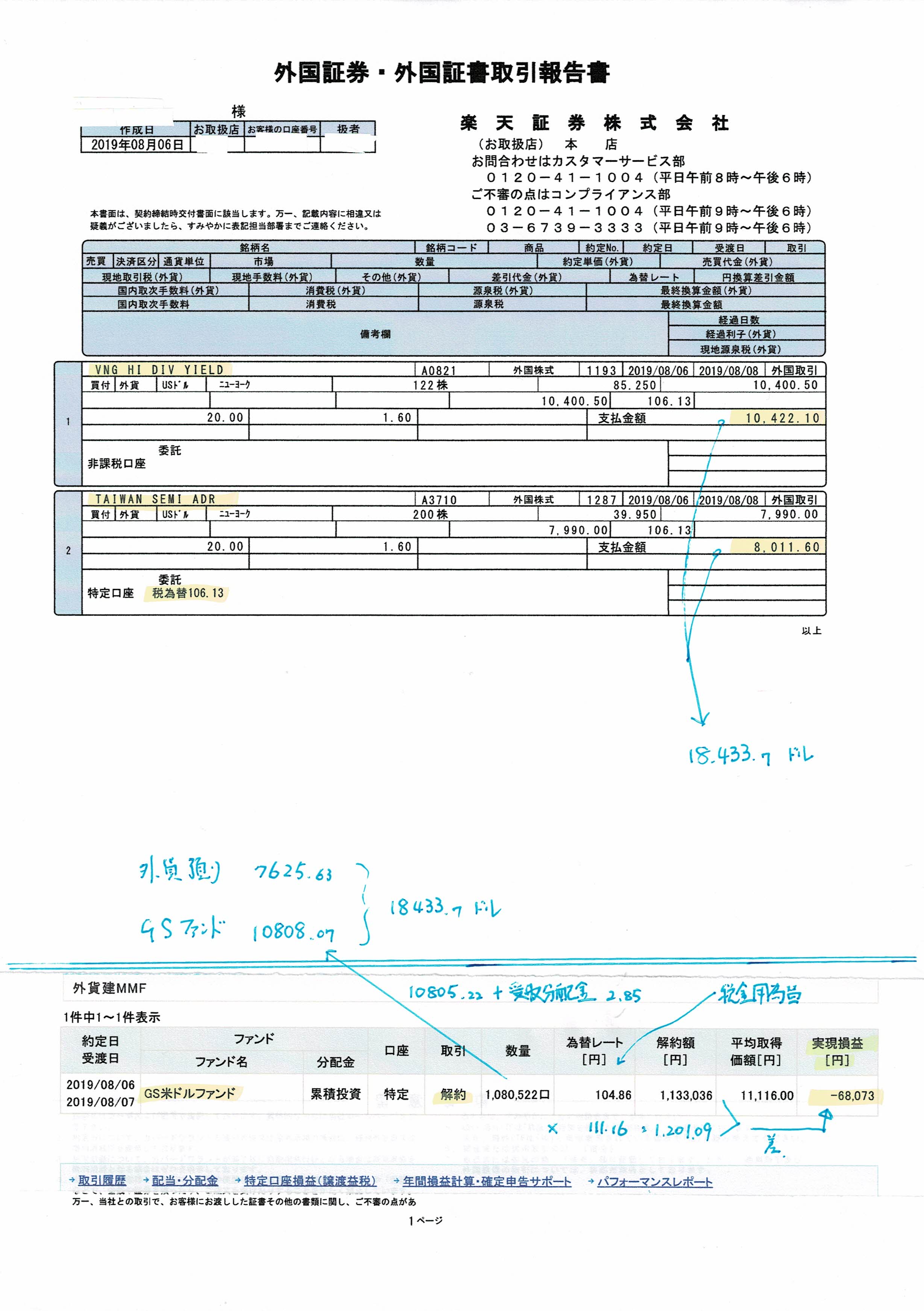 米国株の待機資金は、GSドルファンドと米ドルに半々ぐらい。さて、どちらが良いものか???【想定】2019.8にVYMとTSMをGSドルファンド直接買付により購入したとする。VYM 122株 × 85.25ドル = 10,400.50ドル+手数料21.6ドルTSM 200株 × 39.95ドル = 07,990.00ドル+手数料21.6ドル外貨預かり → 7,625.63ドルGSドルファンド解約 → 10,805.22ドルGSドルファンド分配金 → 2.85ドル(国内課税後)GSドルファンド解約による実現損益 → ▲68,073円税金用為替レート → 104.86円GSドルファンド年利 → 1万ドル分を1.2%想定 → 120ドル【考察】実際の数字を並べては見たものの、よく分からず。ドルからドルなので、為替手数料25銭は掛かっていないはず?実現損益のマイナス分は、ドル間でも為替リスクが発生するの?それとも、円安でGSドルファンドを買って円高で売ると節税になる?【結論】為替手数料25銭が掛かっていない前提で、GSドルファンドの年利1.2%は魅力的だから、運用管理費用0.7%が掛かるとしても、待機資金先として、GSドルファンドを活用していく。2023/10/06追記10/1から日興USドルMMFも米国株式の買付可能になったようだ。GSドルファンドとの選択を事前に設定しておく仕様か。2024/11/09追記5/7から楽天・米ドルMMFが加わり、3銘柄で買付可能になったようだ。ファンド名に楽天を入れてきたってことは、何か意味がある?