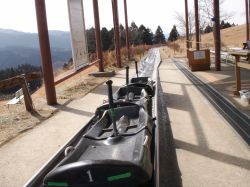 日本一の国民宿舎に続き今日は「日本一のスライダー」の登場です。場所は先日泊まった国民宿舎から車で30分程の所にある「奥日立きらら公園」と言う所。かなり広い所でアスレチックやキャンプ場などもあり夏場にはよさそうな所。そして長~いボブスレーの様なスライダーがありこれが人気のようです。早速我が家も乗ってきました。 真ん中の棒がスロットルレバーで前に倒すと動き出し戻すとブレーキがかかります。全長約900メートル、途中急カーブなどもありブレーキをかけないで行くとボブスレーの様に真横になりながら滑走していきしていきスリル満点でした・・・ およそ5分程で下に着き、そこからは上り専用のウインチで引っ張ってもらうのですが・・これが結構体を前にしてないと後ろに重心がいってしまうのでしんどかった~このスリルに子供は大はしゃぎ!大人も結構楽しめますぞ! 一回¥500なり・・・