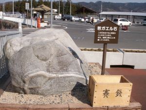 先日旅行に行った時、旅先でこんな物を発見!「若ガエル石」 なんでもこの石に触ると若返り、また無事に帰る事ができると書かれていました。早速、触ってみましたが、ふと下を見ると賽銭箱があるではないですか・・・まあ観光地だからしかたないのかも知れないけどなんかこのカエルが商売繁盛の道具に見えてしまいましたね・・・しかしこんな石、岩?がよくあったものです。ゲロゲ~ロ!