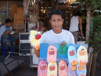 ウィークエンドマーケット内には様々な物が売られてますが、子供の土産に何か良い物がないかと探していたところ、こんなものを発見!パペットマメットみたいですね~(最近見ないなぁ~)何気なく見ていたところ、おじさんが手にはめて盛んにアピールしてきました。値段も手頃だし面白そうだったので2つ購入!40Bなり・・・子供達は喜んで??遊んでおりました今は何処へ行ってしまったか・・・