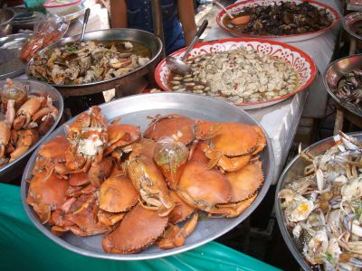 ヤワラーを歩いていると、蟹が見えてきました。ここは海鮮料理の屋台のようですね~。蟹以外にも牡蠣、貝が調理されて置かれています。牡蠣は小粒だけどぷりぷりしてそうで美味そうですよ~見てるだけで腹の虫が騒ぎだします。でもここで食べるには、ちょっと勇気が必要かも・・・何せ、ここは気温30度以上、湿度もたっぷり、氷で冷やしてはあるようですが・・・さすがの私も遠慮してしまいましたでもヤワラーから戻ったあとは人気蟹料理を食べに行くので、あえてお腹を空かせておくのでした