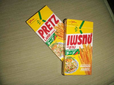 長かった(?)バンコク旅行も終盤に近づいてきました最後にしなければならない事と言えば?そう、お土産探しですね~いつもデパートやスーパーの食品売場で物色します!タイへ行かれた事がある人ならあの物価の安さには驚かれた事でしょう!何買っても安いですからね!しかし、安いからと言ってあれも、これもと買ってしまうと荷物は増えるし、金額だって結構いってしまうのですよ~では買った物を少し紹介!お土産の定番!「ラーブ味のプリッツ」ですね~これがビールのつまみには最高!ピリッと辛くスパイシーな味がたまりまへん!土産用として10個入りの箱でも売られています。このプリッツを買ったら、もちろんこれも買わねば・・・そうタイビールの代表「シンハー」ですね~バンコク旅行中、何本空けてしまった事か・・・暑いせいかグイグイいけてしまうのです日本でも売られてるのを見ましたが・・・値段を見て目がテン・・・さぁ~お次は??