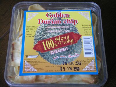 前回に続きバンコク土産の紹介ですタイに行って食べたくなるフルーツと言えば??そうドリア~ンですね~皆さんはお好きですか??果物の王様と言われてるドリアン!あの匂いは別として、とても美味しいですね~しかしあれだけは買って持って帰る事が出来ないのが残念です。ホテルへの持ち込みも出来ないですからね~でも土産類の中には乾燥させてスライスしたサクサクドリアンやドリアン羊羹なる物もありますが、私的にはどちらもお味は今一つしかし、これだけは唯一お勧めできる品ですその名は「ゴールデンドリアンチップ」です!!なんともゴージャスなネーミングですね~見た目は「サクサクドリアン」に似てますが油で揚げてあるチップスなのですよ~味は、塩味で歯ごたえのあるポテトチップスって感じでしょうか・・・触感がすごくいいのです食べ出すと、かっぱえびせん状態になるのですよ~「やめられない♪止まらない♪~」ビールにもよく合います