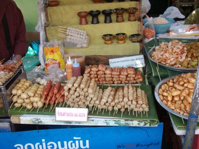 バンコク市内をブラブラ歩いてると沢山の屋台を目にします。売られてる物も様々!雑貨、衣類、果物、乾物・・・一番多いのはやはり食べ物ですね~あの美味そうな匂い!たまりまへんね~こちらは串焼きですね~ここはソーセージやつみれ系の屋台です。ピリっと辛くて甘めのソースをかけてくれます。ソーセージは買うと一口大に切ってくれるのですこっちは焼き芋に焼きバナナです。焼き芋は日本と同様、甘く香ばしい匂いを漂わせていました・・・しかしここは南国タイ、日本だと焼き芋は冬のイメージしかないですよね~暑い国で焼き芋はちょっと・・・焼きバナナの方がいいな!