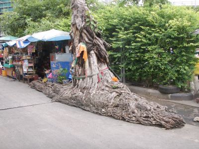 宿泊しているホテル近くの裏通りを歩いていると何とも不気味な木が道路に生えているではありまへんか根がアスファルトに這うようにせり上がった何とも不思議な形の木ですね~富士の樹海の様です近くに寄って見てみると・・・なんと根の間に仏像が祀られているのでした。何か由来のある木なのでしょうかね?~バンコクの不思議発見でした