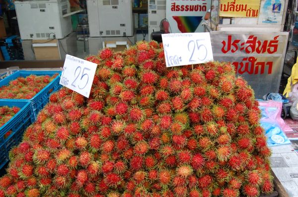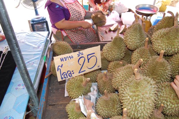 さて、まだまだチャオプロンタラートにおりますよ~タイに来ての楽しみの一つに「美味しいフルーツを食べる」って言うのがありますね~タラート内にもお馴染みのフルーツが安く売られていました。こちらは「ランブータン」、キロ25バーツ(100円)であります。大きさにもよりますが1キロで20個以上はあるのですよ~こちらは日本でもお馴染みの「マンゴスチン」ですね~キロ20バーツ(80円)安いですね~こちらも15個くらいはありますよ~そして果物の王様「ドリアン」であります。ナント!キロ25バーツ(100円)ですよ~小さめのもので1個、2キロ弱!これは、買って食べるしかありまへんな~と言うわけで、ドリアン購入から解体、食す、までをじっくりと紹介していきまっせ~
