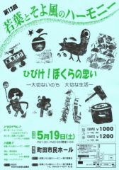 今年で13回目になる、オリジナルの歌、ミュージカル構成のコンサートです。 とびたつ会や公民館の障害者青年学級のメンバーを中心に実行委員会形式で行ってます。 自分たちの生活から生まれた思いを歌やミュージカルを通して伝えていこうという、手作りのコンサートです。 若葉とそよ風のハーモニー コンサート ひびけ!ぼくらの思い ―大切ないのち 大切な生活― 日時 2007年5月19日(土) 午後1時30分開演(1時開場) 場所 町田市民ホールにて(町田駅から徒歩5分) みんなが観た後、元気になります。お近くの方(遠くてもいいから)ぜひ、観に来てください。 わたしも昔、4回くらい出演でたことがあります。