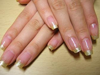 先週に引き続き、ゴールドです♪ フレンチなんだけど、まっすぐラインなので幅だけ合わせれば良いし、ラメを上からかぶせるのでラインがちょっと位くずれていても目立たないし楽~♪ 今までつけたことの無いゴールドも爪先だけだから派手派手じゃないので付けやすいです。実物はもうちょっとキラキラしていて可愛いです。クリスマスには赤・緑色でハートやリボンやお花を描くと可愛いかも♪