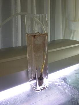 孵化容器は100均の一輪挿し(花瓶)を愛用してます☆説明書の通りに水道水に塩をまぜ(慣れてくるとスプーンでこのくらいかな?と適当)ビンにブラインと塩水を入れますそしてエアレーション☆説明書には水温を28℃にすると書いてありますがめんどくさいのでミホは他の水槽の上に置いてます(笑)(ライトの側に)倒さない様に注意が必要ですが・・・こんな感じ☆結構アバウトな孵化方法でも9割近く孵化しますよ☆孵化したらエアレーションを止めしばらく放置(その間に他の魚達にご飯をあげてます)すると、下からのライトのあかりに集まってきます上に殻が浮いてくるのでスポイトで取り除きメッシュカップに入れてブラインを洗い稚魚達にスポイトであげてます♪食べる姿が可愛くてね~(≧∇≦)