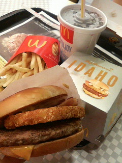 電気代が初めて2万超えてさすがにちょっとビビッたミホですo( ̄Д ̄o)さて☆ビックアメリカ2 第2弾 アイダホバーガー今日からでしたので早速行ってきました☆第1弾のテキサス2バーガーがミホ的にはイマイチだったので第2弾はどーしようかなと思いましたが・・・アイダホバーガーは普通でした好みの問題ですが、これと言って嫌なところも無く美味しくいただいてきました☆でも、1度食べればじゅうぶん(笑)次は食べないと思いますついでにジューシーチキンセレクトも食べてみました☆美味しかったんですけどちょっとスパイシーすぎかな?男性には好まれそうですが女性や子供にはちょっときついかも?