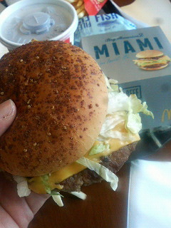 ビックアメリカ2 第3弾 マイアミバーガー食べてきました☆美味しかったで~す(*^ワ^*) ただね、すっごく混んでてさ・・・日曜のお昼だし、まぁそれはしょうがないとしてハンバーガーが腹立つくらい雑に作られてた・・・いくら混んでてももう少しキレイに作るようにした方がよいのでは?残念ですね