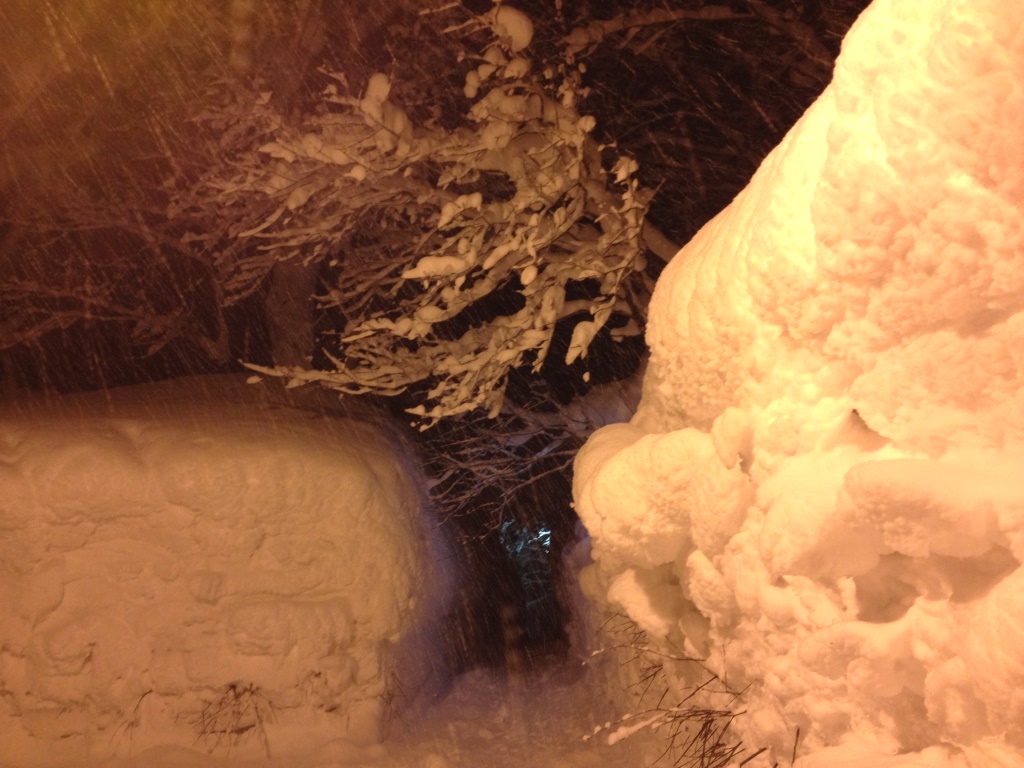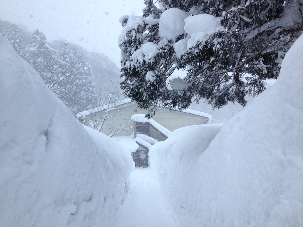 混浴露天風呂に入る勇気はありませんが、夜、女性専用になった時に行きたいので、とりあえずどんなところなのか見てみようと思い行ってみました。こんな雪の中の細い道を通って行きます。