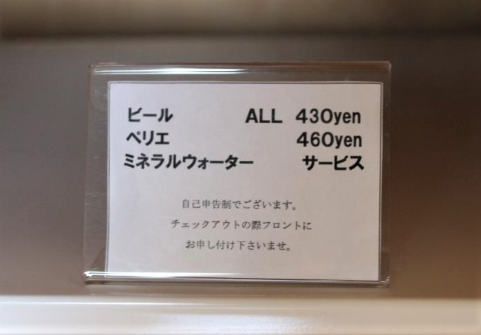 冷蔵庫の中はビールとペリエは有料。ミネラルウォーターはサービス。