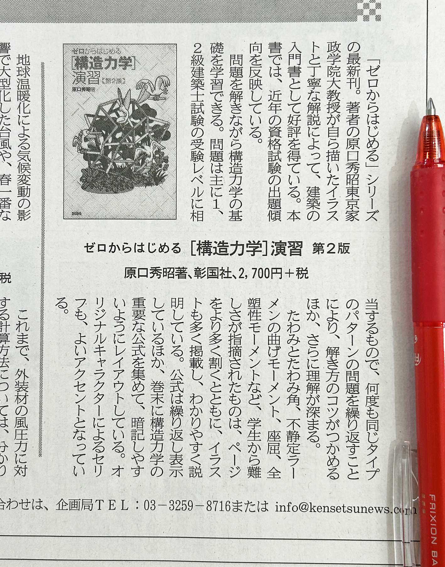 「構造力学演習」が日刊建設通信新聞に載せていただきました!構力マラソンが終了!構力マラソン 第2版 動画リストはこちら『ゼロからはじめる [構造力学]演習』の第2版が出版されました!『構力マラソン 第2版』のテキストです。異なるパターンの過去問を追加し、解説、記憶術やイラストを増やして、38頁増量しました。大学での教え子たちの疑問に答えるため、基本事項を徹底的にやさしく解説する部分もつくりました。各問題の解説を1本ずつのユーチューブ動画とした『構力マラソン 第2版』も、それに合わせて追加しています。誤り:p64のA5行目 MB+6×3=0 → MB+6=0 7行目 MB=-18(kN・m) → MB=-6(kN・m)建築設備 を身近なものからビジュアルに解説!建築設備 を建築士過去問演習を中心としてビジュアルに解説!S造を施工、構造を含めてビジュアルに解説!1級建築士対策 の決定版!2級建築士対策 の決定版!建築法規 試験対策 の決定版!法規スーパー修正部分2025 1級建築士受験スーパー記憶術 新訂第2版 修正、追加部分2025 建築法規スーパー解読術 新訂第5版 修正、追加部分建築法規の入門書はこちら↓構力マラソンの動画リスト建築士の構力問題を集めた本↓構力マラソンのテキストの第2版。構造の基本を学ぼう!の動画リスト構造の基本を描いた本↓ ゼロからはじめるシリーズの17冊目、ゼロからはじめる近代建築入門が出版されました!約400頁のすべてにイラストを付けました。ライト、ミース、コルビュジエ、グロピウスばかりでなく、ラッチェンス、ガルニエ、ペレも深堀り。西洋と日本の建築史について書いた本。入門書の体裁で書いていますが、オーダーなど、ところどころ深掘りしています。表紙の絵は古代ローマの大浴場の漫画化。絵はイラストレーターの内山良治さん。動画リスト リスト中の青字をクリックすると動画が再生されます!1級建築士受験スーパー記憶術2級建築士受験スーパー記憶術建築計画入門!構造の基本を学ぼう!構力マラソン 構造力学を毎日1題解こう!建築法規の基本を学ぼう!法令集の読み込み講座!環境工学の基本を学ぼう!木造建築入門!インテリアデザイン入門!動画リストのリスト建築初心者は、まずこの10冊↓で学ぼう!マンガで苦手理論分野が学べます!