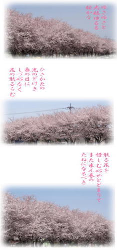 桜3月、こちらでは、本当に寒い日が多く、洋服選びに迷ってしまう日々だった。”桜の開花も、いつもより遅くなるのかな?”と、思っていたけど、普通だったみたい。遠くからでも、淡いピンク色の綿あめのように見えすごく綺麗だ。”お花見は、身体にたまった「水毒」を流し、新しい「運」を、生じやすくする。”と、某風水師の方が言っていた。「水毒」の意味は分からないけれど、身体に、とっても良さそうな気がしたので、とりあえず、桜の木が、たくさんある場所へと出かけてみた。やはり、どちらを見ても、人、人、人・・と言った感じで、”本当に、これが、身体に良いのか?身体にたまった「水毒」は、流れてくれたのだろうか?”家の近くにある、桜の木。川沿いに植えられていて、大好きな風景だったのだけど、祖母の話によると、伐採する事が決まったらしい。既に、枝が、切られている個所も・・ ↑↑理由は、木の管理をしていた人達が、高齢になり、色々な事が、出来なくなってしまったのだけど、それを、新たに、引き継いでくれる人がいないから。と言う事らしい。害虫駆除を、きちんとしないと、近所の方々から、毛虫の被害による苦情が寄せられるので、これ以降は、無理と言う事で。”近くの人は、家の中で、お花見出来ていいな~。”と、思っていたけど、桜の木は、毛虫がつきやすい為、”綺麗だね。”と、喜んでばかりはいられないのだと言う事を知った。この地区の人の多くが、皆、春になると、花が咲くのを楽しみにしていた訳だけれどそれは、管理してくれてた方々がいてくれたから。”今更”と言った感じだけど、”感謝!!”と言う思いで、いっぱいになった。祖父も、良く、「今日は、桜の木の消毒をして来た。」と言う話をしていた。”草を刈った話や肥料の事とかも言ってたっけ。”と、過去の会話を想い出す。あまり、気にとめた事もなかったけど、”毎年、皆を感動させるような桜を咲かせる為には、こんな風に、陰の努力が、あったんだな~。お年寄りって、すごい!”と、今になって、心から感じる。桜の木が、とても可哀想だと思うけど、毛虫に、自宅の敷地まで這って来られたら、これも、とても困ってしまう事なので、仕方ない事なのだろうか?でも、やはり・・来年から、いつもの場所で、散歩中に、お花見出来なくなってしまうと思うと、残念でたまらないし、悲しいなァ。って事も・・そして・・とても、淋しい。それは、祖父が、年老いてしまった事に対しての気持ちと、似ていると言うか・・もしかしたら、全く同じものなのかも知れない。ビスケットみたいなネギこれは、とっても不思議な事に・・食べても食べても、生えて来る。本当に・・。ずっと前、植えられたものなのに、薬味のような感じで、少しずつではあるけれどずっと、ずっと食べているのに、”まだ、まだ大丈夫ヨ!”みたいな感じで、どんどん伸びて来る。「不思議なポケット」の中のビスケットみたいなネギ」さんです。「不思議なポケット」ポケットの中には、ビスケットが、ひとつポケットをたたくと、ビスケットは、ふたつもひとつたたくと、ビスケットは、みっつたたいてみるたび、ビスケットは、増えるそんな不思議なポケットが欲しいそんな不思議なポケットが欲しい。今、思ったのだけど、”ビスケットが割れても、数は増えるな~。”って。ブログ村 群馬HOMEへ