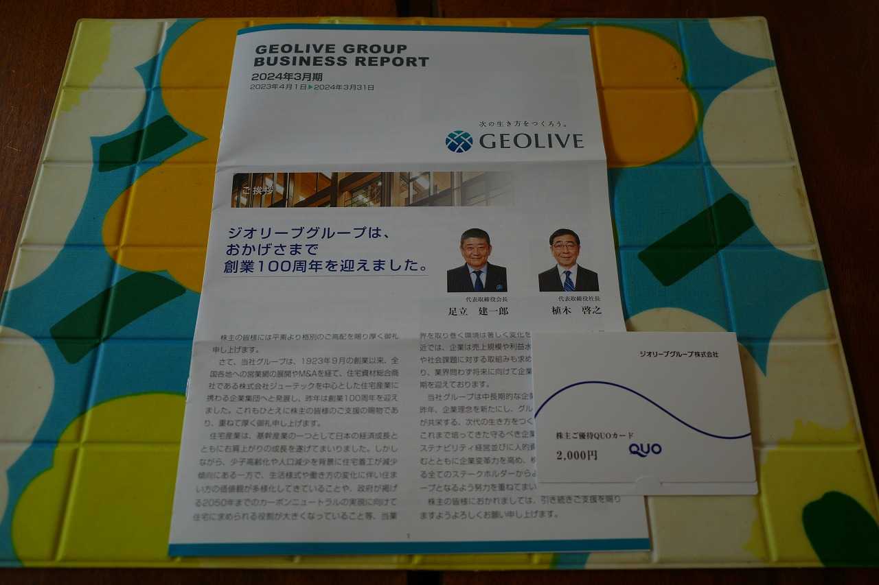 さて今日は2021~25PF概況シリーズです。 586位 3157 ジオリーブグループ(東S、3月優待) ◎ PF時価総額586位は、建材卸大手のジオリーブグループ(旧ジューテックHD)です。 現在の株価は1175円、時価総額162億円、PBR0.67、自己資本比率は26.0%、今期予想PER9.17、配当利回り4.1%(48円)、総合利回り5.8%(48+20=68円)で、優待は100株保有で2000円相当のクオカードです。 ジオリーブグループは指標的に安いですし、業績も安定していますし、PF下位としては申し分のない良い銘柄であると評価しています。