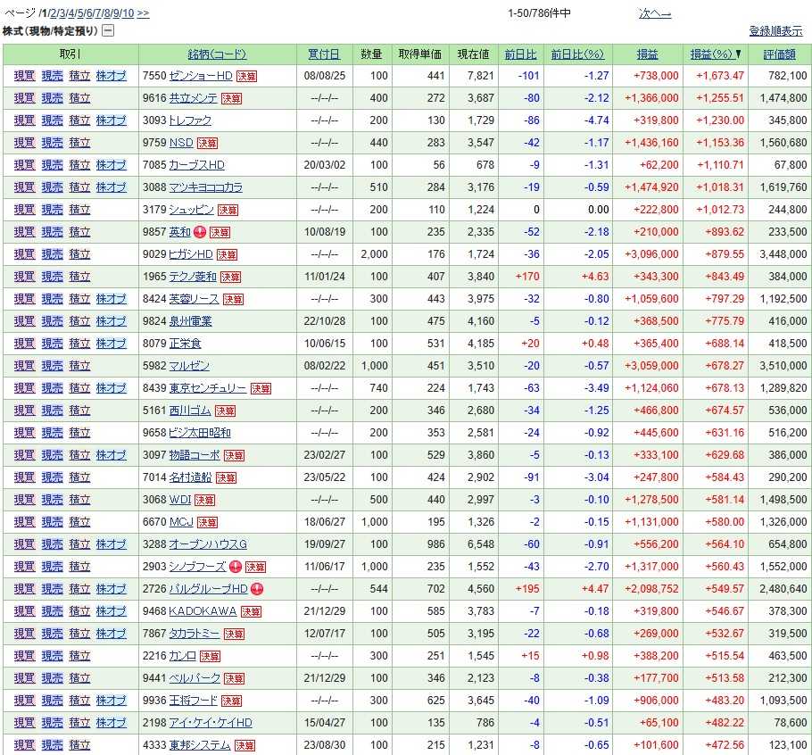 さて株式投資で大きな資産を築くにはいろいろな方法があると思いますが、一番シンプルで再現性が高いのは、「将来大きく上昇することになる銘柄を値上がり前の段階でたんまり仕込み、じっくり・まったり・ゆったり鬼ホールドしていく。」事かと思います。 「みきまるさん、何言ってんだ。そんなことできる訳ないだろう。」と思う方がいらっしゃるかもしれませんが、未来と現在を等価に考える 「迂回戦略」 を取れば実はそんなに難しいことではないと個人的には考えています。 というか、これは多くの成功した上場企業の創業社長さんが実際に資産家になったやり方そのものでもあります。たくさんの成功者がいるということですね。 それでは具体的にはどのくらいの値上がりをすればその銘柄が自らの資産形成に「効く」ことになるでしょうか? ま、やっぱり10倍=10バガーは理想的には欲しい所です。それが無理でも5倍=5バガーは目指したいですね。 そこで今日は、自分のポートフォリオ内で「過去5倍以上になった銘柄」を抽出して、それらにどのような傾向があるのか、更にはそこから一歩進めて「未来の10バガー候補」を具体的に探ってみたいと思います。 それでは始めに、私が2025年7月21日現在で保有している786銘柄中で5.7倍以上になったものの一覧表を見てみましょう。何故5倍じゃなくて中途半端な5.7倍かと言うと該当銘柄数が多過ぎてリストが1枚に収まりきらなかったからです。10倍以上が7銘柄、5.7倍以上が24銘柄となっています。こうしてみると結構たくさんあることが分かりますね。(上記データはSBI証券より引用) 、、、そうだ、いつかはちゃんと書こうと思っていたし、いい機会なのでここできちんと書いておきたいことがあります。それは、2022~23シーズンにPF1位で戦った 2726パルグループHD がきちんと6バガーを達成していることです。 ネット上ではよく「みきまるはPF1位で戦った銘柄では、2196エスクリ(2015シーズン)、6425ユニバーサルエンターテインメント(2018シーズン)など、全て大敗している」という言説があります。そしてこの2つの銘柄でワイが結果を出せず、それどころか目の玉が飛び出るほどの巨大な損失を出し、止む無く片腕を切り落として半死の状態で撤退した、これは間違いのない厳然たる事実です。 その一方で、前述の2726パルGHD、2012シーズンに2位で戦った 3097物語コーポレーション など大きく上昇して利益を上げた銘柄達も当然にあります。そうでなければ今ここで元気に毎日ブログを書けていないです。 もっと言うと、ボロ負けしたエスクリやユニバーサルエンターテインメントでの戦からもたくさんの貴重な教訓を得ています。いやむしろ大きく成長できたという確かな実感があります。「負け方の経験値と引き出し」が膨大に増えたからです。そういうすべてを糧として「明日には今日よりも1ミリでも良い投資家になりたい」という熱意に燃えて日々を過ごしてます。 何が言いたいのかと言うと、 「ワイが過去に主力に抜擢して激アツで戦った銘柄では、いつもいつも100%負けているわけではなくて、たまにはちゃんとガツンと勝つ時もある」 ということです。良い子の皆様は、今日はこれだけ覚えて帰ってください。 、、、すいません、悪い癖が出て前置きが長くなりした。「未来の10バガー候補を探そう」という話でしたね。 具体的に私の持ち株で5.7倍以上になった子達の特色を見ていきましょう。まず目につくのは外食銘柄が多いことです。驚異の17バガーとなった7550ゼンショーHDを筆頭に、3097物語コーポ、3068WDI、9936王将フードと4つも入賞しています。 ま、最近の相場は 「優待付きの外食株」が極めて高く評価される傾向にあり、「一種のバブル」化している感じもある ので、ここから新規で外食株を買って10バガーを目指せるか?と言うと、ちょっと厳しいかなあと自分は思います。と言うか、どの外食株も既にPBRやPERなどのシンプルな指標で見て高いですからね。 ただそれでもこの「外食株の当たった時の爆発力」は決して侮れないと感じています。最近でも北海道と北関東地盤のラーメンチェーンの3399丸千代山岡家が爆裂上昇しました。その観点から私は現在、指標的には激高ではあるものの、優待利回りが高くてラーメンが美味い一風堂を経営している 3561力の源HD を準主力クラスで保有しています。 次に目につくのは、リユース銘柄が多いことです。10バガー越えに 3093トレジャーファクトリー と 3179シュッピン が登場しているのを筆頭に、 2780コメ兵 も大きく上昇しています。 そしてインフレの激しく進む日本では現在リユース市場が急激な成長を遂げていることから、自分はこの リユース業界から「次の10バガー」が出てくる可能性は結構あるのではないか? と考えています。 具体的には「セカンドストリート」が店舗型首位であるにも関わらず、合法ではあるものの資産管理会社を使ってややトリッキーな自社株取引をする社長さんの「遠藤ディス