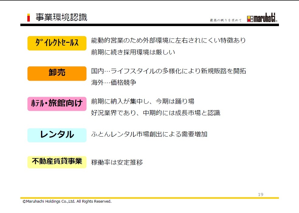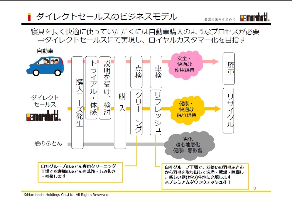 お布団の製造から販売までの効率的な一体モデルを確立しています。同業のほかの会社は時代が変化していく中でほとんど淘汰されてしまったので、有力なライバルがいない、残存者利益を享受できる素敵な状況となっています。