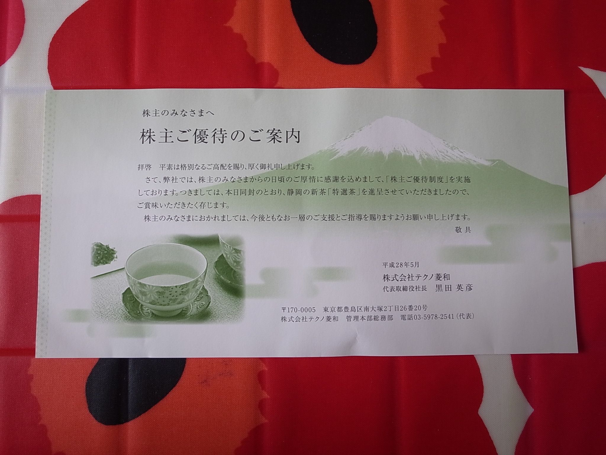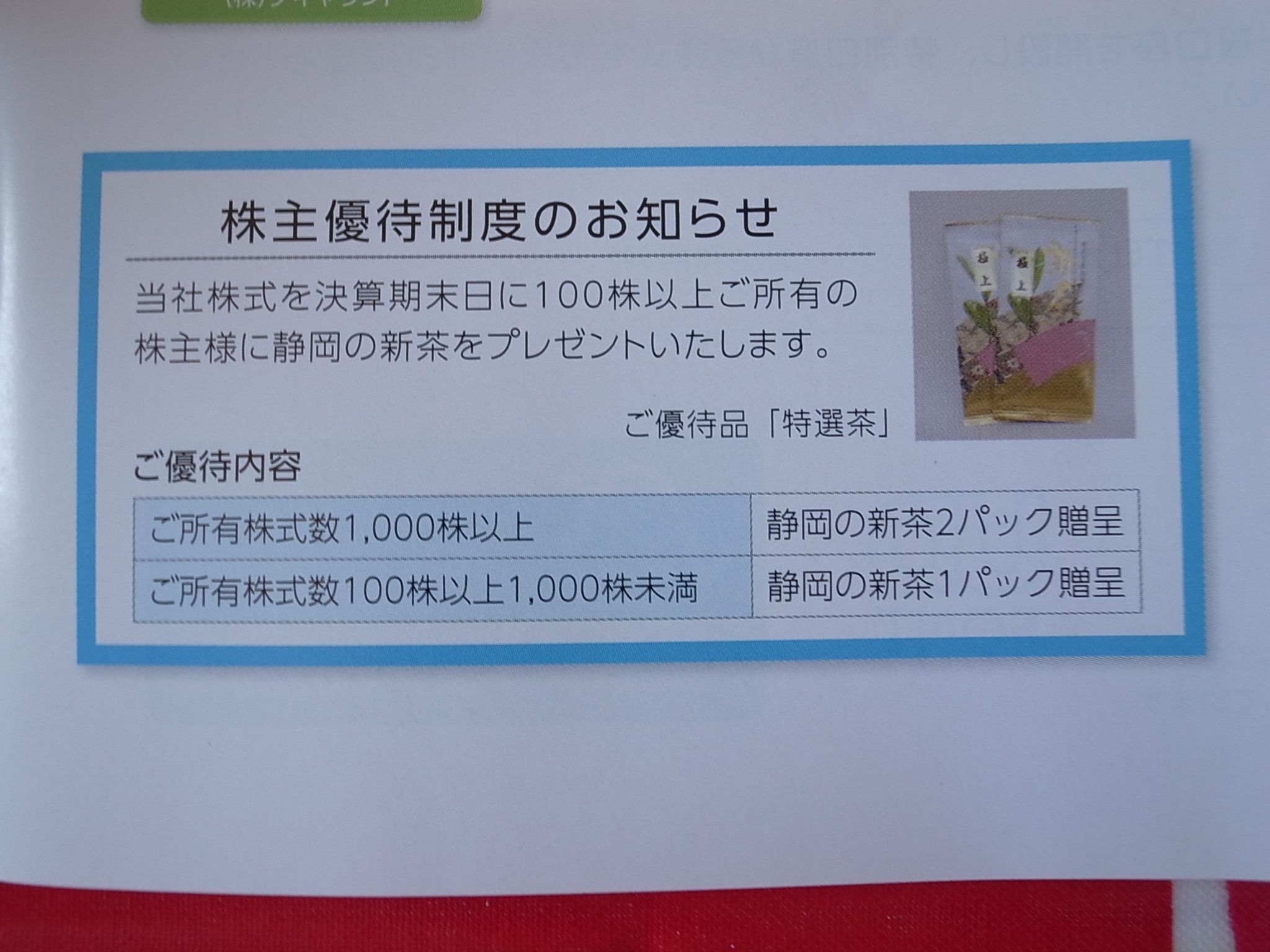 現在の株価は790円、PBR0.55、株主持分比率は61.1%、今期予想PER9.78、配当利回り2.5%(20円)、総合利回り3.2%(20+5=25円、優待品は私の独断で500円で換算)で、優待は100株保有で3月株主に静岡県新茶(例年は30グラム、ただし極上品で実に美味しい。)です。