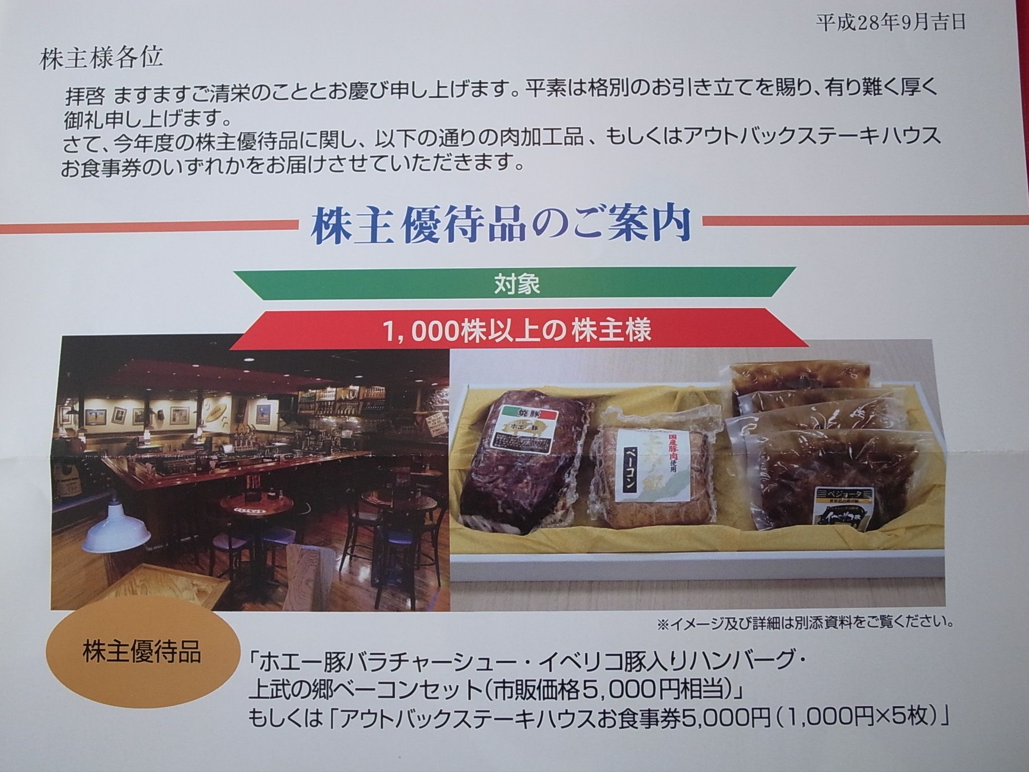 プラス年1回7月に、500株保有で3000円相当、1000株保有で5000円相当の自社取扱商品(ハム・ソーセージ)もしくはアウトバックステーキハウスで使える食事券です。