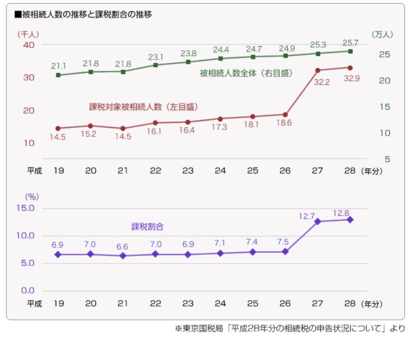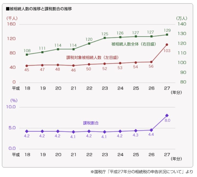 そしてここがポイントですが、私達人間はいつか必ず死にます。国税庁のデータによると2015年の相続税増税によって課税対象となる被相続人は増税前の4%強からほぼ倍の8%となっており、これはつまり、