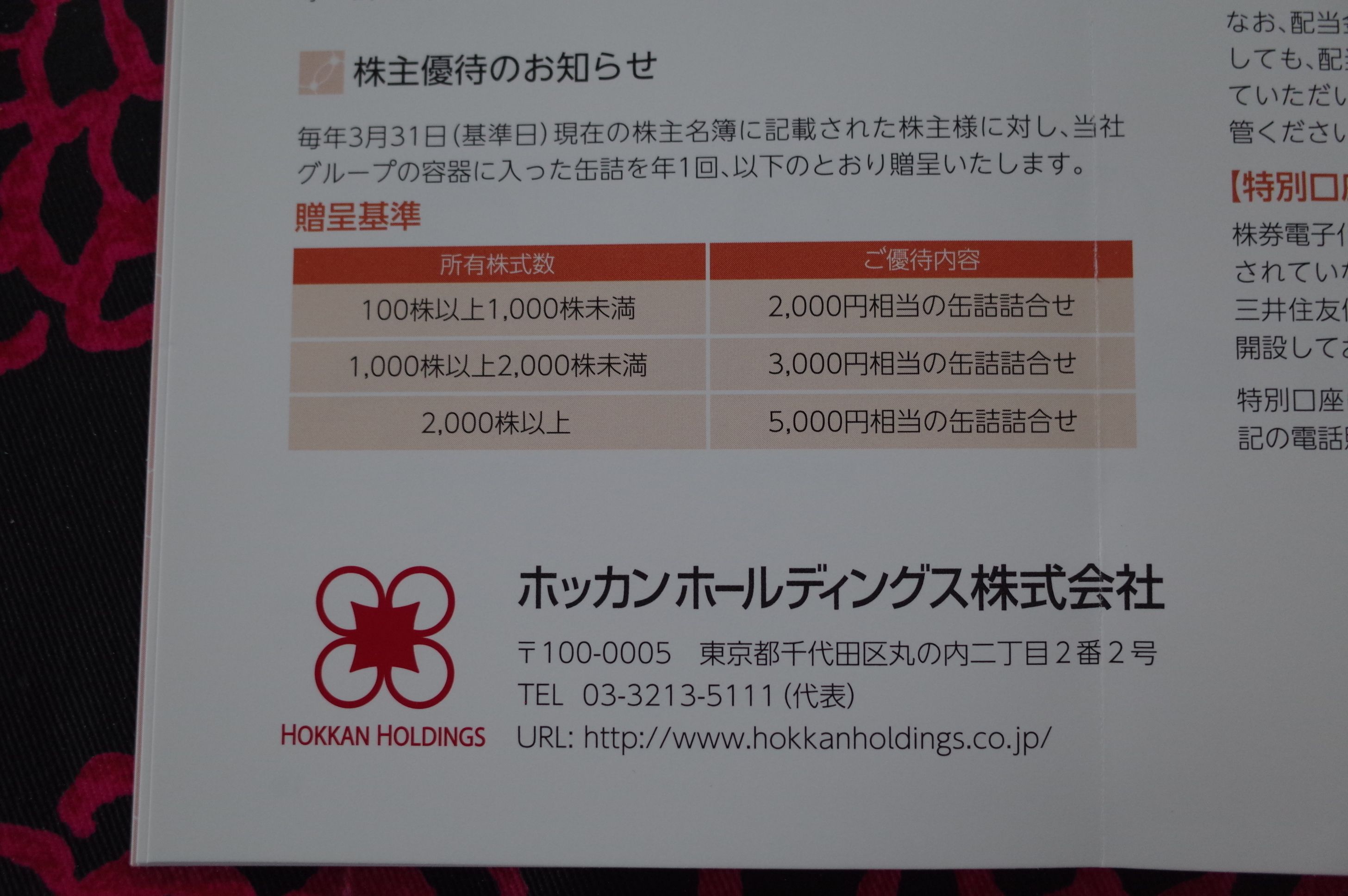 さてそんな素敵なホッカンHDの現在の株価は2006円、時価総額270億円、PBR0.42、自己資本比率40.2%、今期予想PER6.27、配当利回り2.1%(42.5円)、総合利回り3.1%(42.5+20=62.5円)で、優待は100株保有で2000円相当、1000株保有で3000円相当、2000株保有で5000円相当の缶詰詰め合わせです。