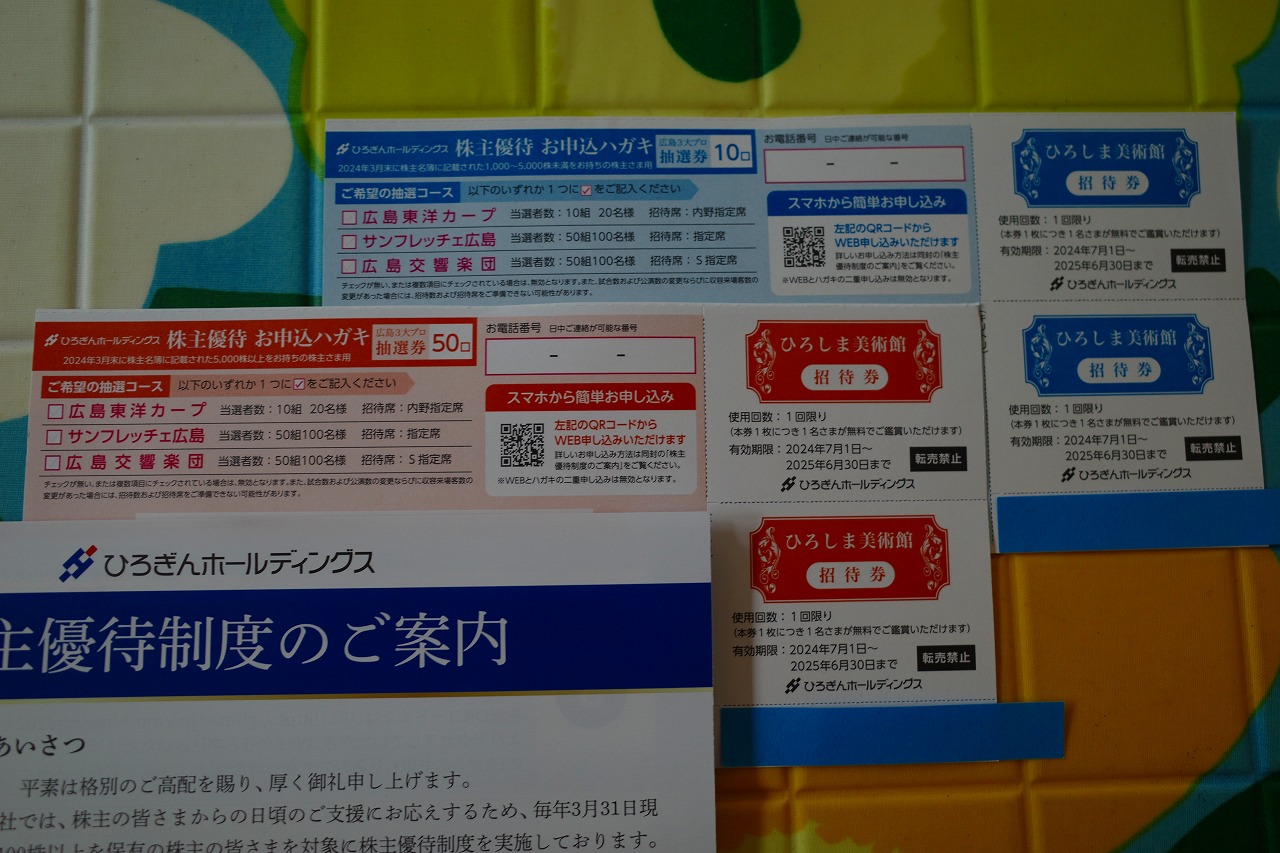 公益財団法人ひろしま美術館の招待券2枚のメルカリ平均落札価格は800円、優待ギフトカードは500円相当なので、100株保有時の総合利回りは、5.4%(54+8+5=67円)とかなりのものです。