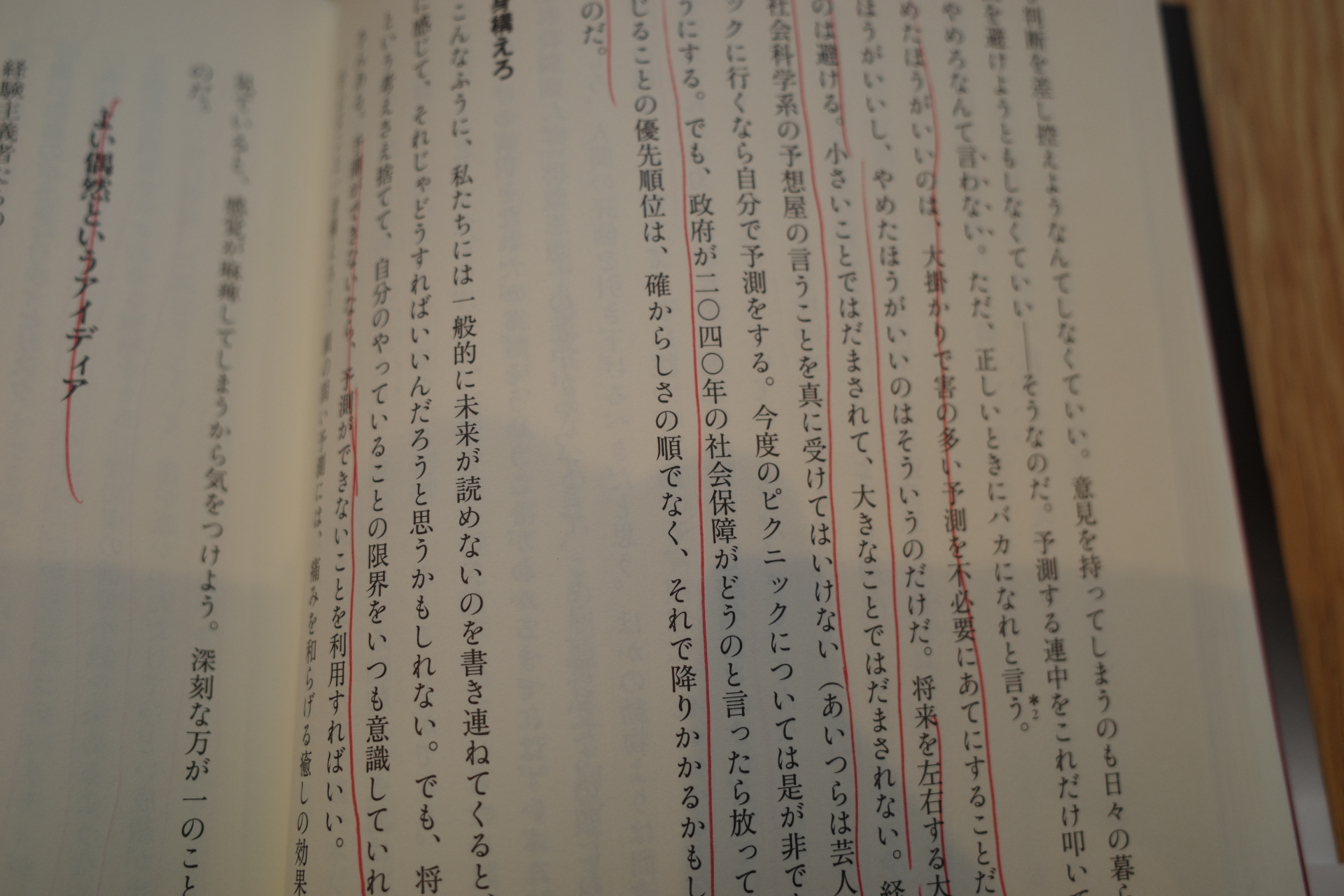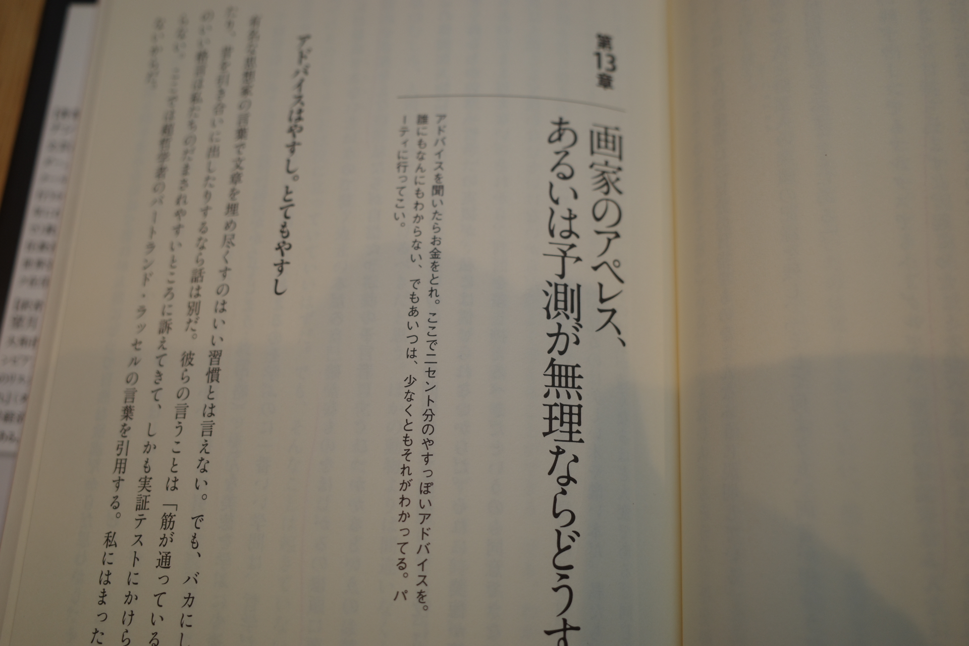 やめたほうがいいのは、大掛かりで害の多い予測を不必要にあてにすることだ。将来を左右する大きなことで予測に頼るのは避ける。小さいことではだまされて、大きなことではだまされない。経済の予測をする連中や社会科学系の予想屋の言うことを真に受けてはいけない(あいつらは芸人なのだ)