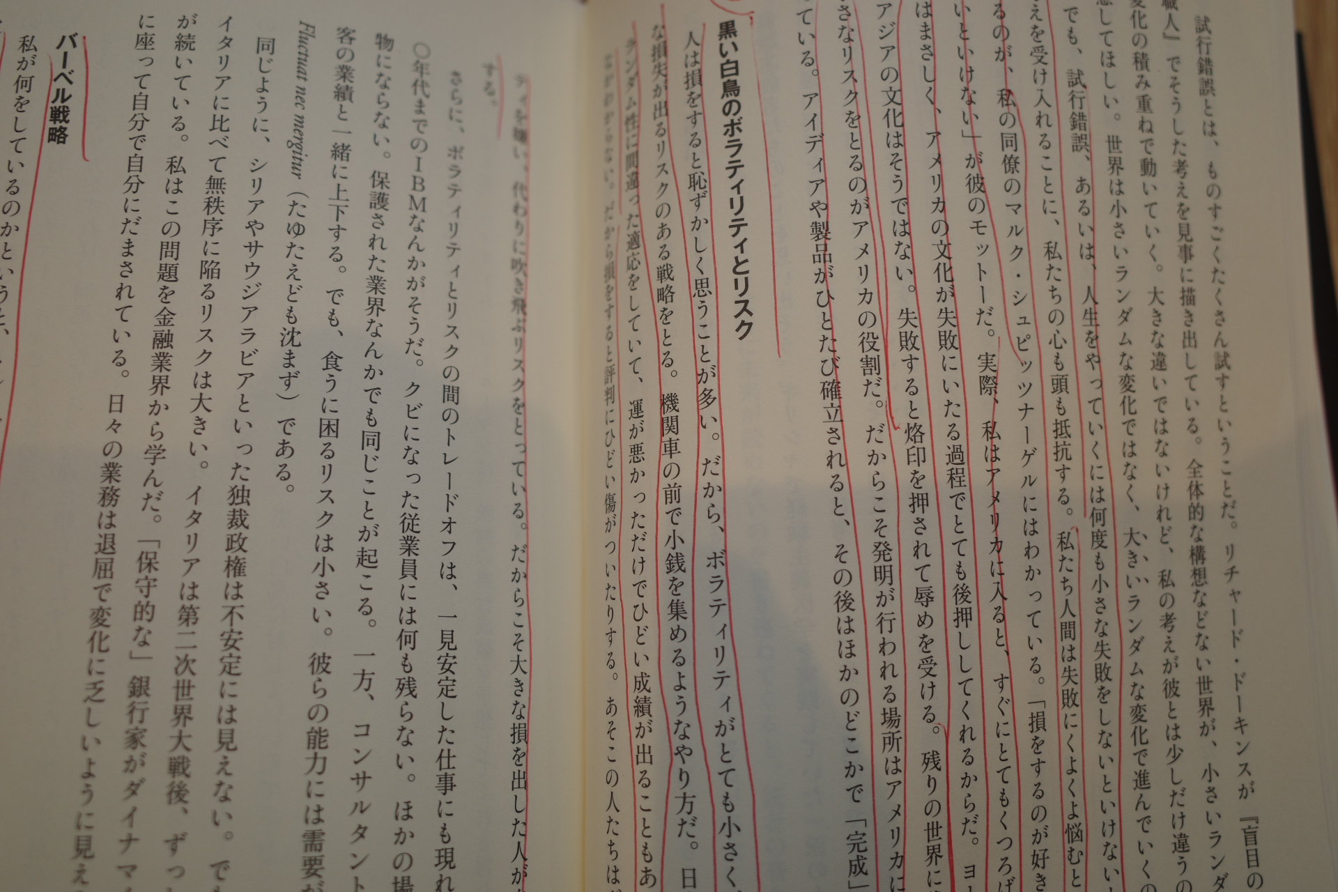 世界は小さいランダムな変化ではなく、大きいランダムな変化で進んでいくのだ。でも、試行錯誤、あるいは、人生をやっていくには何度も小さな失敗をしないといけないという考えを受け入れることに、私たちの心も頭も抵抗する。私たち人間は失敗にくよくよ悩むところがあるのが、私の同僚の マルク・シュピッツナーゲル(彼の傑作のブラックスワン回避法の書評も近日登場予定。お楽しみに。!)にはわかっている。「損をするのが好きにならないといけない」が彼のモットーだ。