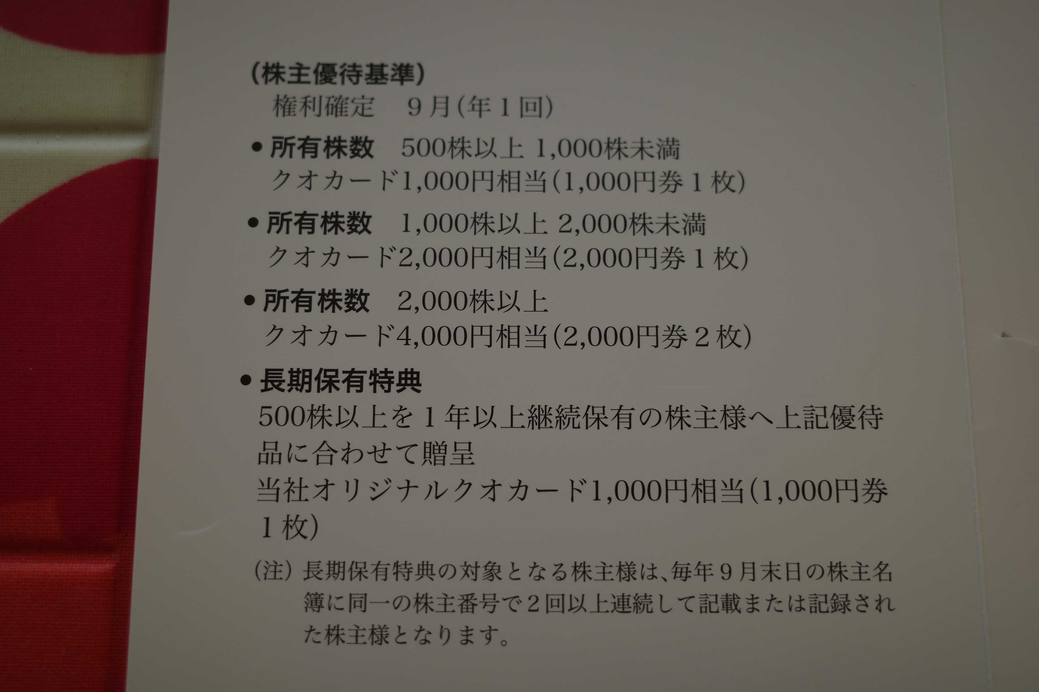 %(50+2=52円)で、優待は年1回9月株主に、500株保有で1000円相当、1000株保有で2000円相当、2000株保有で4000円相当のクオカードです。また長期株主優遇優待制度もあります。