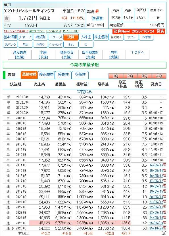 ヒガシHDは地味な運送会社ですが、過去安定してしっかりと利益を出し続けており、またマイルドながら着実な成長力もあります。