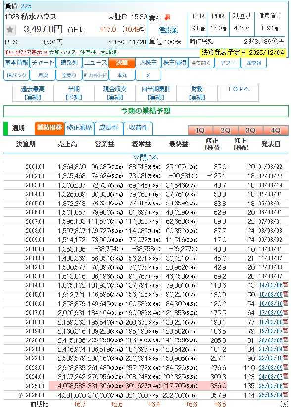 PF時価総額104位の上位銘柄は、ハウスメーカーの雄で、戸建てから賃貸住宅、マンション等に展開している積水ハウスです。
