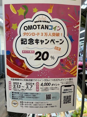 秦野市には、「おもたん」といって、登録店で買い物すると、20パーセントがポイントバックされていた。(個人店は、40パーセント)。何とお得!でも1月31日で終了した。……と思っていたら、第2弾ともいえる、記念キャンペーンが行われていた。3月7日まで。