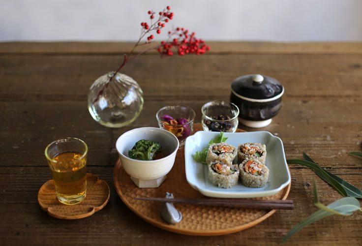 高塚和則さんの丸盆に東屋の木瓜角皿。。