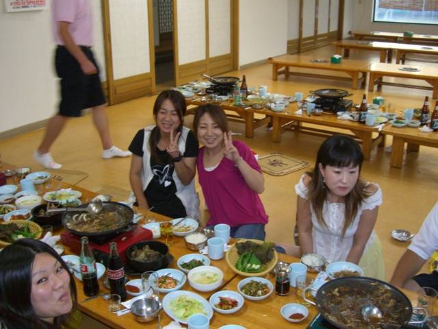 試合が終わると、子どもたちはそれぞれホームステイの家族に引き取られ、私たちはKBCの指導者たちとともにプルコギのお店に行った。私は食べたことが無かったが、韓国のすき焼きということらしい。牛肉と玉ねぎとえのきなどをちょっと甘いだし汁で煮込んだものかな。これが相当いける!またしても腹一杯食べてしまった。韓国に来てすっかりダイエットを忘れてしまった!
