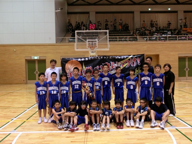 南大阪のオータムカップ最終日が羽曳野コロセアムで行われた。うちの男女は予選を勝ち上がってベスト8に残っているのだが、今日の午前が土曜参観のため試合開始を遅らせてもらった。それは有難いのだが、そのために男女とも勝ち上がれば試合と試合の間が1試合しかないという強硬日程になってしまった。まずは男子。準々決勝の相手は、T代田さん。今まで一度も戦ったことが無い。できればキャプテンを温存して勝ち上がりたいところだが、相手がどのくらいの強さか分からずまずはキャプテンを1Qrに出した。相手には大きい子もいたが、しっかり守って点差も開いたので、キャプテンは1Qrだけでお役御免。控えの子もいっぱい出して、まずは1勝。準決勝の相手は、Mヶ丘さん。この試合はキャプテンを休ませている暇は無い。1Qrから全開に飛ばして、15対4とリードを奪う。2Qrは3対6と少し追い上げられたが、3Qrのベストで14対6と引き離し、4Qrもそのままの流れで、43対22で勝利。決勝へ進んだ。決勝の相手は、1週間前にトライアンズカップで1点差で勝ったK明台さん。この前の勝ちがツキだけじゃないことを証明しないといけない。相手の1Qrは前回と同じメンバー。もう対策は考えてある。だが相手もこちらに対して対策を考えたのか、一気に突っ走ることは出来なかった。1Qrは、8対5。2Qrも前回と同じ作戦。相手の4番を3人で守るということ。これも効果を発揮してこのQrは、9対5。前半は、17対10という点差だった。前回が15点引き離したことを考えるとあまり出来は良くないようだが、これがほんとのところだろう。そして後半。前回はミドルが後半にまったく入らなくなった嫌な思い出がある。だが今日は違った。パスがよく回り、そこから切れ込んで行ってのシュートがよく決まった。また大事なところでみんながリバウンドによく跳びつき、相手にセカンドチャンスを与えなかった。最後はしっかり時間を使って3点差を守り切り、27対24での勝利。快心とは言えないが、しっかりやることをやっての勝利だった。南大阪では3年ぶりの優勝かな。みんな良く頑張ったね!そして女子。準々決勝のK竜寺さんの試合では余裕があったが、準決勝のI大津さんとの試合では、4Qrまでもつれる展開で、最後にやっと突き放すことが出来た。だが決勝のY野さんは、格が違ったな。相手が強いのは分かるが、ボールをもらって前も向けないのでは相手を抜けるはずが無い。もう少し戦う気持ちを見せてもらいたかったな。いつも言うようにうちは女子の方が能力が高い子が多いのに、試合になるとそれが発揮できない。男子はどのチームとやっても自分たちの力が出せるが、女子はちょっと相手が強いと腰が引けてしまう。そのメンタルの部分を何とかしなければ、いつまでたってもY野さんには勝てないだろうな。準優勝は頑張ったと言えるのだが、Y野さんを少しくらい焦らせる試合をしないとほんとに強くなったとは言えないだろうな。