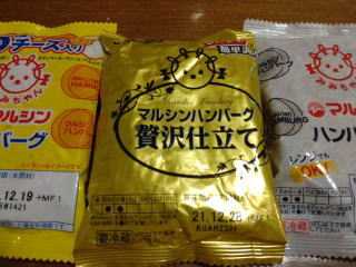 マルシン独自の油脂コーティング製法で、油を引かずにフライパン調理はもちろん電子レンジ調理でも美味しく召し上がれますでお馴染み、当方の主食マルシンハンバーグシリーズで、金色に輝く贅沢仕立てなるものを発見!イオンで。マルシンハンバーグはもう25年くらい食ってるけど、これあまり見かけないかな?あるいは販売店が少ないとか??検索中。。「従来のマルシンハンバーグと違い、原材料に鶏肉を使っていません。豚肉6対牛肉4の比率になっています。これにより、ジューシー感、肉粒感のあるハンバーグに仕上がりました。また、生の玉ねぎとソテーオニオンを共に使用し、玉ねぎの旨みと甘さを両方楽しめるようにしています。さらに隠し味に赤ワインを加え、コクと深みのあるワンランク上の美味しさを実現しています。」(マルシンフーズ )まあ普通の100円でこれ150円だしね。うちの在庫の左のチーズはそろそろ食わないとな。