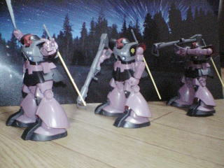 ガイア、マッシュ、オルテガの3人からなる黒い三連星。ジェットストリームアタックとは、黒い三連星が使用した攻撃フォーメーションの名前であり、もともとは宇宙での対艦船戦闘用に考案されたものであったらしい。これ造るのに2時間かかったけど、背景(↓)の厚紙が入ってたのはうけた(笑。