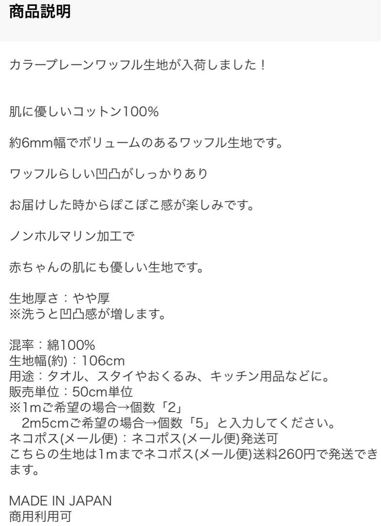 綿100%カラーワッフル生地50cm単位【3970WF】【1mまでネコポス(メール便)発送可】【8色】