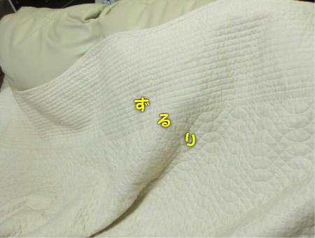 最近、ソファーカバーがずれてる事が多いんです。 なんでこんな風になるのか、よっぽどとんかつくんの寝方が悪いのか謎でした。 昨夜、初めてこうなる現場を押さえました。 カバーの下に潜り込んで、端っこから進んでる模様。 画像が悪くてお見苦しいですが、ご了承ください。スクープ写真に、あせる私です。 写真はボケボケですが、ワルの目つきは隠せません。 何事もなかったかのように、足早に逃げて行きました。証拠写真を撮られてるとも知らずに。 そして今日もまた、カバーをいい塩梅にして、他人事のように気持ち良さそうに寝るとんかつくんでした。 ↑開ききるまでちょっと待ってね♪ありがと~(o´・ω・`o)ノ゙