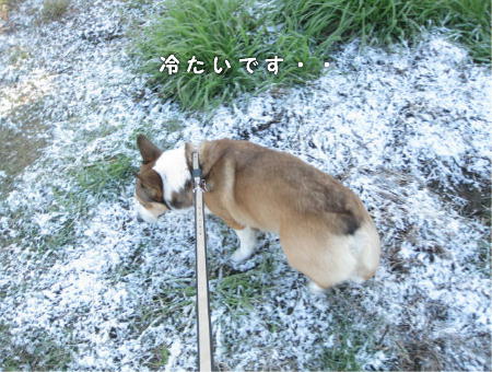 昨日の朝も今朝も、雪が少しだけ積もっていました。 我が家のジャングルも積雪。でも、朝だけなんです。午後からは、ほとんど溶けてしまいます。 そんな中、とんかつくんとお散歩。 道路は完全に溶けていますが、広場など下地が土の所は、雪が残っていました。 とんかつくん、なかなか動きません。 食べてるんかな~?って思い、観察しましたが、どうやら、ただ鼻を突っ込んでるだけの模様。 冷たかろ? もしも~し・・・カキ氷じゃありませんよ~。 しかも、シロップかかった氷なんて食べた事ないよね?憧れってヤツかしら? ちなみに、私はイチゴ派です。あと、カルピスも♪(←原液イケる♪)皆さん、お好きなシロップありますか? ↑開ききるまでちょこっと待ってね♪ ありがと~(o´・ω・`o)ノ゙