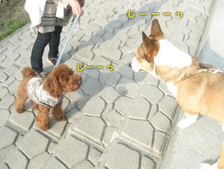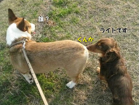 今日の日記は昨日の続きです。 さて、ミニチュアダックスのビッキー君と遊ぼうとしていると、何やら背後から・・・ 大胆にもおちりから登場したのはまたまた新たなるミニチュアダックス。 しかもライト君って・・・ あ~・・夏にあったことあるね~。 なかなかのマイペースで、とんかつくんにくっついて来た子だね~。ライト君も覚えていてくれたのかな? それにしても、よくよく考えてみるとここは男の子ばっかのイケメンパラダイス(* ‘∀‘) とんかつくんもこのパラダイスに混ざりミニチュアダックス3&コギ1のGメン’75ばりの男達の大移動をしているとまたまた新たなるワンコに遭遇。 ところで、Gメン’75ご存知かしら? ん?今度は何やら険悪なムード。まるで、すれ違い様のやーさん状態( ̄□ ̄;) どうやら、この子も男の子のようですな。 オー!ノー!・・・ヨーコ?^^; この直後、仁義なき戦い勃発!ガウガウガウ~~~~!! 初めて、とんかつくんの真の男の姿を見た私( ̄▽ ̄;) 決定的瞬間を撮るのも忘れてしまい、ドウドウドウ・・・とたしなめ、ふと思い出したあの子。 どうやら、気合注入は効果てき面だったらしい。 そして、距離を保ちながら飼い主さんとお話をしている間、イケメン達とははぐれたのでそのまま川へ直行。 今年初入水。 そして、日が暮れて来て、寒くなってきたので上がることに。 泳いでないよね?泳いで美味しいってヘンよね? また来ようね♪ ★おまけ★南陽工が甲子園の初戦を突破しました♪かっぱくんも全く忘れてた校歌を聴いたようです。でも、次はPLと・・(TT) 悔いのないよう頑張ってね。 ↑ 2月1日付のクール・ドッグ・サイトに選ばれたそうです。 ここをクリックすると下の方に投票用紙があるので、 必要事項を記入の上、投票いただけると嬉しいです。 3月末まで、1日1回投票できます。2回目からは名前とアドレスだけでOK! ↑開ききるまでちょっと待ってね♪ ありがと~(o´・ω・`o)ノ゙