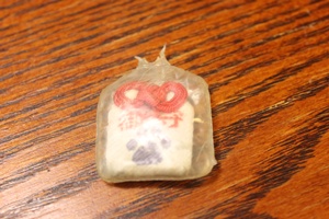今日、夕飯の後片付けをしながら、とんかつくんがお手手をペロペロしてないか様子を伺いに行くと、静かに寛ぐとんかつくんの目の前に、お守りが落ちていました(´;ω;`) もう2年以上も、とんかつくんの首輪に付いていたお守り。覚えてらっしゃる方もいるかな・・? ぴいちゃんが中3の修学旅行の時に買って来てくれた大切な物。 お守りが落ちるって言うのは、あまりいい気分はしません。せっかくぴいちゃんが買って来てくれた物でもあるし・・。 特に、子供の頃の私はペット運が良くなかったので、こういうのは気になるんです(-_-) 早速、かっぱくんに直してもらいました。 直してる間中、とんかつくんもじっと見ていたそうです。 愛着あるもんね、気になるよね^^ 無事に直って、首輪をつけた所を写真に撮ろうと思ったら、今度はぴいちゃんをガン見。 回転焼(今川焼)を食べるぴいちゃんの姿は、かなり魅力的らしいです( ̄▽ ̄;) まあ、無事に直って良かったですわ・・もう落ちませんように^^ ではまた~~ ランキング参加中♪1日1回応援よろしくお願いします<(_ _)>