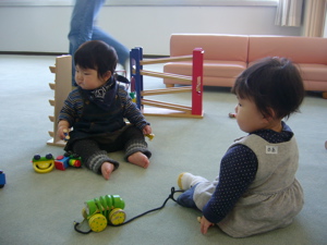 今日はおかーたん午前中テニス。はるぽんは待合室で他のお子ちゃまたちと一緒に待っててくれました。他のママさんたちにもすっかりなじんでいるようで抱っこされたり遊んでもらったりしてます。ありがたいこっちゃ・・。(^人^)帰りの車で爆睡したはるぽん。家に着いても寝てたので、寒くもないし(むしろあったかい)そのまま車で起きるまで寝かせることにしました。その間おかーたんは車の近くで庭いじり。土をほりほりして花を植えました。土を触るなんて久しぶり。笑段ボールに入ってるときはきれいだったのに土に植えると隙間がたくさん空くからかミョーに寂しい。これをきれいに計算して植えるなんてガーデニングってのはさぞかし難しいのだろう・・。思うに、土をいじるとか、海に入るとか山を歩くとか、野菜や果物を収穫するとか、息が切れるような運動をするとか、汗をかくとか、そういう原始的な行動をとるとなんだかシンプルな気持ちになれる。ぐちゃぐちゃいろいろ考えたりもやもや体が疲れてたりするとシンプルな気持ちになれなくて自分で自分を複雑にしてしまって余計に疲れてしまうみたい。なんだかごちゃごちゃ書きましたが土いじりをしてとても楽しかったのです。笑草むしりや土の手入れをちょくちょくやろうっと。今日は午後からりくたんとぶうたさんが遊びに来てくれました。前回お休みしたベビーサインの復習会。サインが増えてえらいこっちゃでございます。野菜のサインを覚えれば、ごはんの時に使えるが「大根食べたい」なんてはるぽんが言うのか?あんまり言わない気が・・。でも「お願い(助けて)」とか「熱い」「冷たい」とか、そういう主観のサインはいいよね。気長にやりましょう。おかーたんずがお茶しつつお花している間ベビズは2人で(?)遊んでました。追いかけっこ(?!)したり、絵本を見たり。おとーさん、ボーイフレンドですよ。ぎゅ~とかしてますよ。>はるぽんが。笑あ~写真撮れば良かった。抜けてました。最近多い。アンテナ折れてる。次は撮ります。カメラ逃さず。外に食べに行くのも楽しいけどおうちでお茶飲んでお話しするのも楽しい。子連れではそれが喜楽やね。またやりましょうにゃ(≧∀≦)。