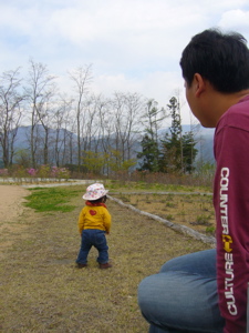 か~え~る~の~う~た~が~き~こ~え~て~く~る~よ~家の前の田んぼに水が入りまして風が涼しくなって来ました。ついでに蛙がげこげこ鳴き出しました。今までどこにいたのでしょうか・・・。さて、はるぽん、「赤ちゃん」サインを覚えましてテレビや雑誌で赤ちゃんが出るとやってます。手を合わせて左右に振ってるよ。たいして教えてないのによく覚えたな。あと「イチゴ」「食べる」が一緒になってしまって判読が難解に。笑「痛い」「一緒」「靴下」も同じ形なので難しい。「リンゴ」「お風呂」も出来るようになったかな。でも「ぞう」「きりん」とか、動物はあんまり。接点が少ないから?「犬」「猫」は同じになってて、「おっぱい」とかなり似ている。「おしっこ」「うんち」は両方「交換」サインのはるぽんバージョン。手をくるくるしますが、「出た」なのか「出る」なのかはワカリマヘン。ちなみに、ん~は、トイレで成功してからほとんどその後はトイレで出てます。ち~は行けば出るけど、おむつでも出る。そんな状況。さて、今日は月曜日。午前に掃除を半分して(半分ではるぽんストップ)洗濯をしてからまったり。午後からここママさんと待ち合わせしてお出かけしました。向かったのは小宮のこどもプラザだったのだけど今日はあいにく閉館日。そこから豊科南部総合公園に行きました。おちゃのじかんでちいただきまちたなにがありまち?えへへへなにげに、ここちゃんとはるぽんは同じ名前なので「***ちゃ~ん」と名を呼ぶと両方振り向きます。笑しかも、ここちゃんがちょっと遠くに行くとはるぽんがテケテケそっちの方向に行って声を上げます。するとここちゃんも返事をするのだけど、それが、はるぽん「*¥@%&~」(親ばかフィルタ「おいで~」)ここちゃん「@&%#*~」(親ばかフィルタ「やぁだ~」)って聞こえるんですけど!!と、ここママさんと興奮。本当のところはどうだか、親ばかフィルタのない方に聞かないと分かりません。笑いや~、広くて人が少なくていい公園♪>ここママさん>また行きましょう!!(≧∀≦)帰りに「蔵久」に寄り、他つれつれと寄り道をして帰ってきました。山がきれいだったよ~。寄り道とか、道草とか、そういう余裕、大事よね。目的のあるばっかりの毎日じゃ、疲れちゃうでしょう。