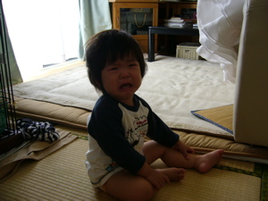 珍しく雨です。雨だと気温が一気に下がります。むしろ寒い。冷えるなあ、って思っちゃう。短い夏が終わりましたか・・・。今日も特に予定無し。午後にKさんがテルミー練に来てくれるので午前は洗濯と掃除。はるぽんがちょうどよく寝て、いい感じにコトが運んだ午後でした。・・・しかし昼寝2時間半したはるぽん、夜は寝ない寝ない。最近寝付きに時間がかかってて、1時間ぐらいかかることも多々。1時間かかると、おかーたんすっかり疲れてしまっていてテルミーの勉強したいのにも~バテバテ。今日も、はるぽん、寝ない。「ねんねね~」と行って部屋に来るまでは順調。「ぱい~」とぱい。すると、「ちっち~!」と言って部屋の外に行きたがる。すわ、トイレか!とトイレに行くと「ない~」。「ちっち~」→トイレ→「ない~」→「ねんね~」→「ちっち~」→トイレ→「ない~」→「ねんね~」→「ちっち~」→トイレ→「ない~」→「ねんね~」→「ちっち~」→トイレ→「ない~」→「ねんね~」→「ちっち~」→トイレ→「ない~」・・・むき~!!!!(#)「ちっち」と言えばおかーたんが連れ出してくれると思ってるのか~?「ちっちないなら行かないよ」と言ったら泣き、そのうち「まんまん(食べる)」と言いだしふかしサツマイモをちょっと持ってきたら「ないない~」と言って泣く。最後はぎゅ~されて、泣き疲れて寝た感じ。・・・体力が余ってるのか・・?そういえばここ2ヶ月弱、ほとんど運動してない。今までテニスやらなにやらしてたのに急に止めてるので、体が硬くなってきてる。肩凝りとかはこれも原因?9月からは週に1回はテニス再開するかなあ。テルミーをもっと効率よく勉強すればいいのだけど。ぶひ~。。うわ~ん最近こんな顔してよく泣きます。