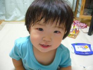 1歳半になりまちた。なんとなく、半、って区切りだよね。おめでと花の似合うオトコあ、小哲は既に7歳ですが。笑さて、え~と、何したんだっけか、火曜日。とりあえず朝からべったりだったことは覚えておるが記憶が曖昧なときは、最近のはるぽんについて書こう。笑最近のはるぽん。重複してたらごめんちゃいね。■きゅうりのことを「きゅ」と言うように。■ぞうさんは手をぐーにして前に出す。 きりんさんは手を裏返して前に出す。サインだね。■サツマイモをふかしたのがお気に入り。■昼、家に居るときはパンツ。 成功率は・・50%ぐらい? とりあえず、出たら教える、は100%。笑■トイレはお子ちゃま便座を使わずに 大人用におかーたんの支えで座るほうがいい感じ。 おなかがぐっと圧迫されるからかな。■夜起きる回数が少なくなって、1~2回になりまちた。 でも多分、本人は起きた記憶が無いのではないか。。 私も自分の起きた形跡があってびっくりするしね。。(汗■朝は6時半に起床。 起きると下に行こうと家の中を台風一過化。・・・朝、2時間でいいから思いっきり寝たい!と思うのは育児中の悩みか。。仕方ないね。■階段降りるときは、後ろ向きになって腹ばいになり、 足をよっこらせ~と出して、かなり慎重に降りる。 どんなに低い階段でも同じコトをしますなり。笑■声だけ「あ~ん」と泣くことも。嘘泣き?■歌をよく歌ってます。 「ちょうちょ」「ぞうさん」は そうだと思えばそう聞こえないこともない。。■お絵かきボードに絵を描いて、1人で 「ぞうちゃ」とか「わんわ」とか言って遊んでました。 ちなみに「じゃあ、おさるさん描いて」と言うと ボードのところに行って何か描いて また戻ってきて「(出来た)」みたいな顔をしてます。 ・・・すごいにゃ。。 でもそのボード用のペンが無くなってしまった。。。 どこにやったのだ。。■おかーたんと同じものが食べたいらしい。 同じものを切ってあげても、おかーたんが食べてるものがいいと 言ってきかない。 取り替えても、結局またおかーたんが食べてるものがいいと・・。■「こうか~ん」「こうた~い」言えるようになりました。■「かいーかい」とよく言います。 日焼け止め塗るときとかに「かわいいかわいいしようね」と言いつつやってたら 顔を触る=かわいいかわいい、になり、 おかーたんが化粧水をつけてても「かいーかい」と言って それを自分にもしてくれとアピール。 まだ化粧水つけんでもいいやろが、と思いつつ。 ちなみに、髪の毛をしばるのも「かいーかい」と言う。 どこかがかゆいのかと思ったら、違ったのね。。今日も元気いっぱいでございます。えへへ~