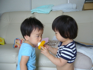 今日は3連休3日目。ぶうたさんファミリーが茨城に帰ってしまう日。ベビズはそんなことおかまいなしに朝から遊びまくり。テレビをつけたらアニメで、歌でノリノリ。あれ、ノリノリははるぽんだけか?笑いしあそび~ならんでみまちた(貴重な2ショット)おじたんもまたきてね~ばいばいたっち10時半ぐらいにぶうたさんファミリーは帰っていきました。道中長いけど安全運転で~。帰っちゃうとちょっと寂しいやね。また、はるぽんが分かっているような分かっていないような、ってところがね。。午後ははるぽんは昼寝。オットは小哲の散歩。はるぽん昼寝から起きたところでおかーたんは買い物へ。TSUTAYAでCDも借りてきちゃったよ。久しぶりだ。オペラなんざ聴きたくなっちゃったりして。聴きたい曲があったんだけど意外に見つけられないんだよね。。どこかで見つけられるかな。