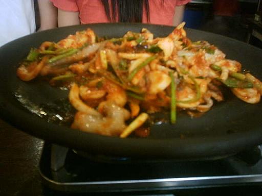 南大門市場の前の大通りを挟んだ向かい側にある『五スニナクチ(旧イガンスン・シルビチッ南大門店)』の「ナクチプルコギ 」8,000ウォンです。以前はTVでも紹介された「イガスン・シルビチッ」のチェーン店でした。ゴロゴロ入ったモチモチしたタコとネギ、タマネギや餅、野菜を鉄鍋で炒めます。とっても辛いですが、めちゃウマっ!!です。〆はご飯を入れて「ポックンパッ」にしてもらいます。水キムチが甘酸っぱくて、とっても美味しかったです。気を使ってくれる、笑顔の奥さんが可愛いかったです。